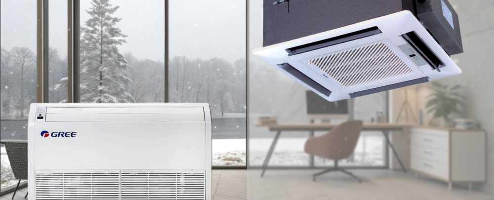 Плюсы: максимальная гибкость монтажа. При напольной установке создает оптимальный тепловой режим (теплый воздух от окна). Не требует подвесного потолка. Хорош для помещений с панорамными окнами, магазинов.